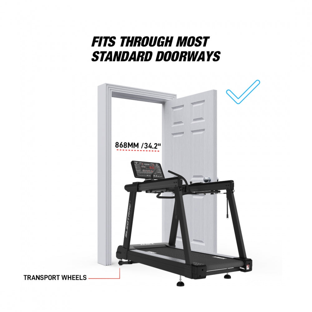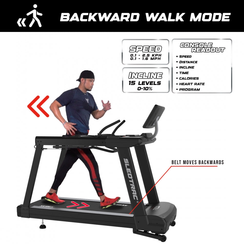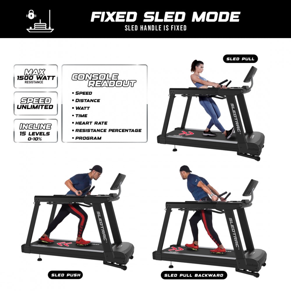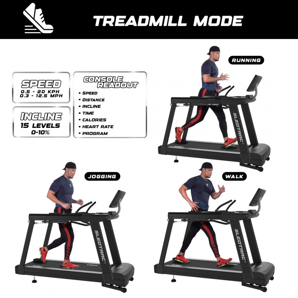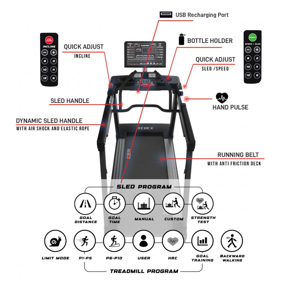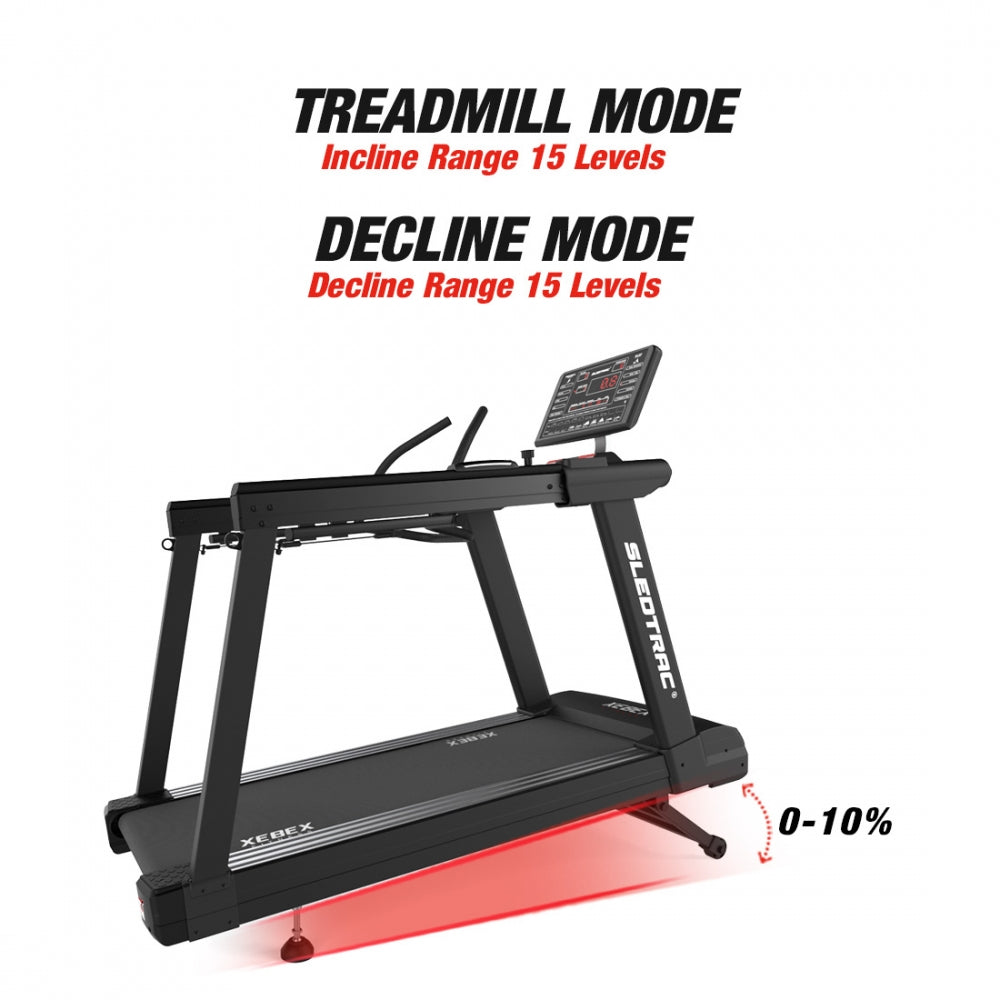 Xebex SledTrac 6000: The most versatile treadmill with 6 different training modes. It combines a motorized treadmill capable of backward walking and decline, along with 1500 Watts of resistance for sled training. All of this thoughtfully packed into a compact, space-saving treadmill. The patented Dynamic Sled Handle activates your core and closely mimics outdoor sled training by moving dynamically with the user.