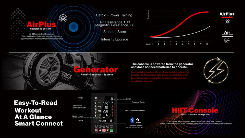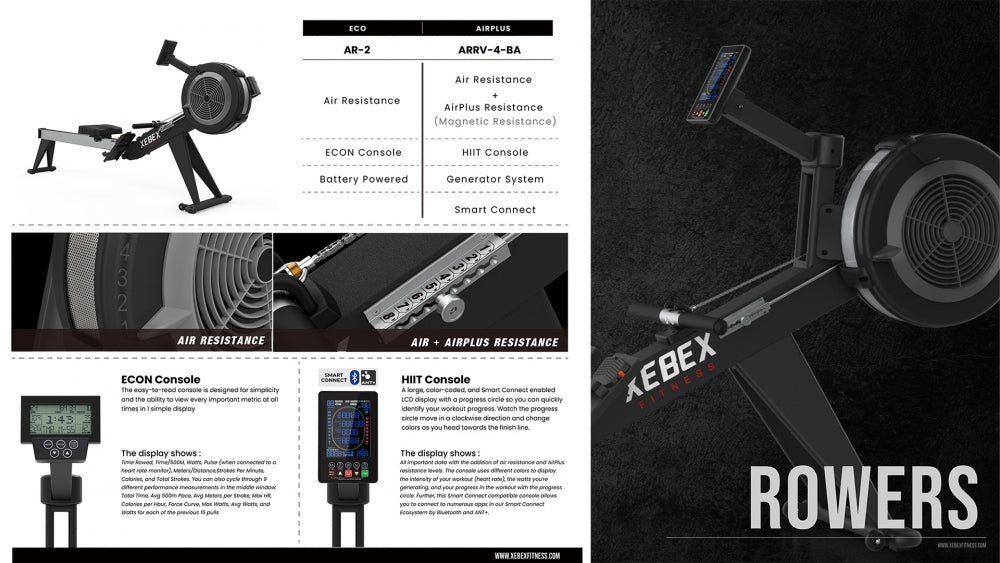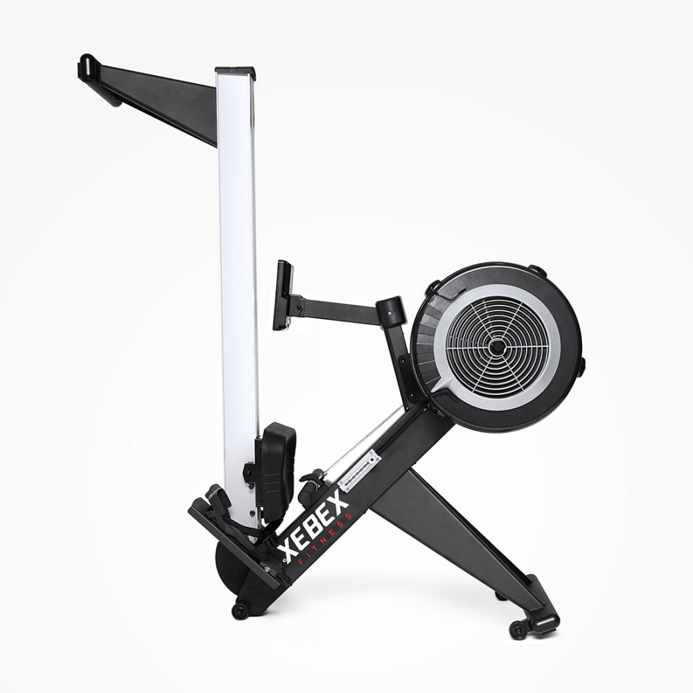The Xebex AirPlus Rower 4.0 Smart Connect features a heavy duty 93LB frame, 10-setting damper to control air resistance and flow,adjustable magnetic resistance from levels 1 to 8, more comfortable seat and seat height, as well as the ability to fold into less than 50% of its original footprint and roll into storage on 4 wheels.