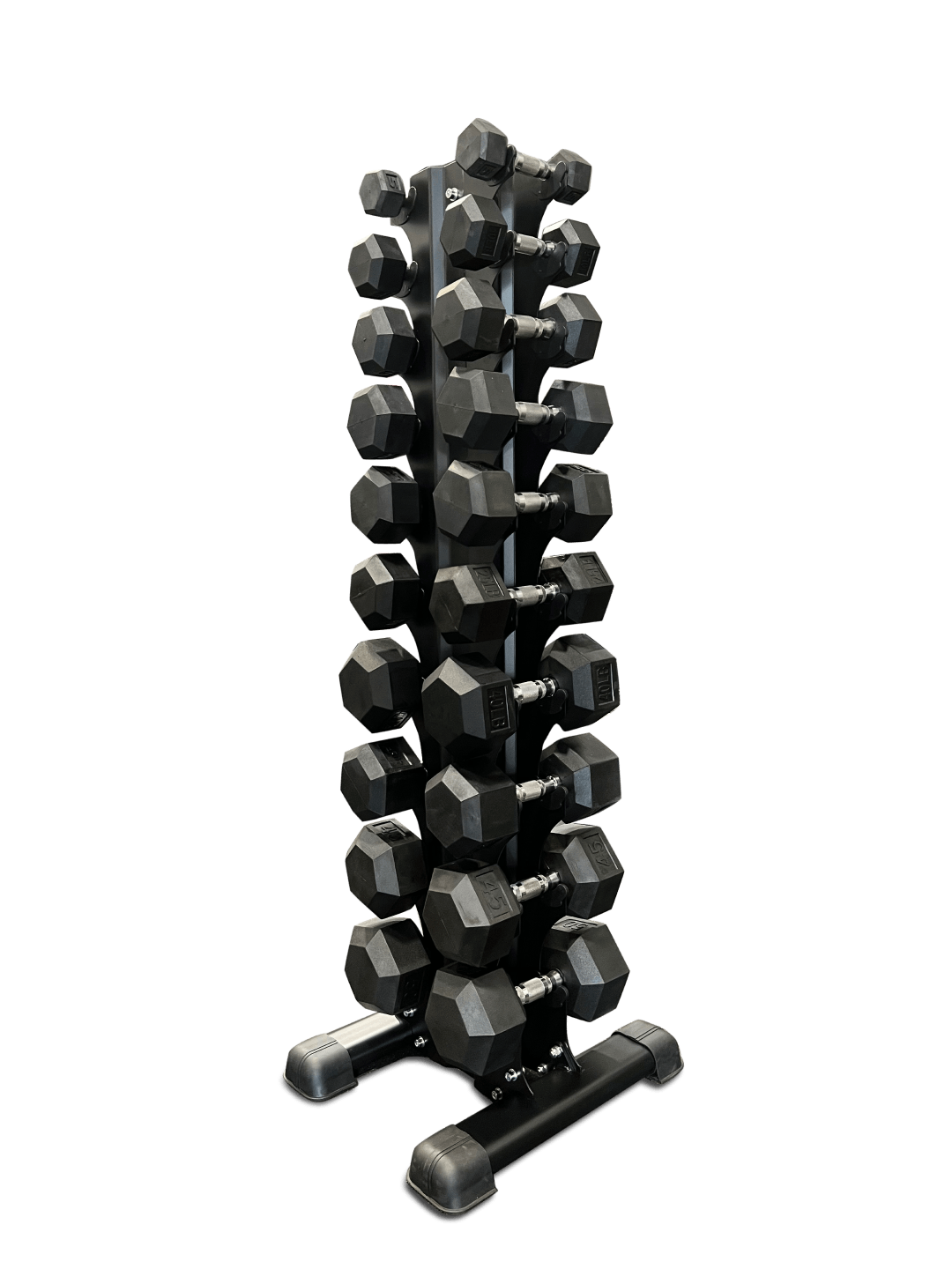 Holds a 5-50lb Rubber Hex Dumbbell Set (not included). Slim design to save floor space.